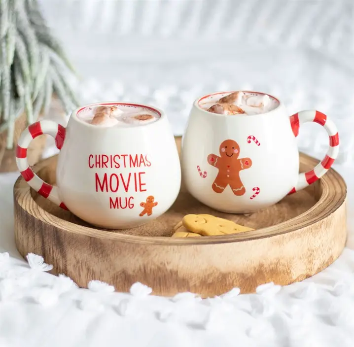 This festive mug is the perfect addition to your mug collection this Christmas. A rounded design that fits perfectly in your hands, the mug features a smiling, cute gingerbread man design with the text 'Christmas Movie Mug'. Finished with a perfect candy cane striped handle.
